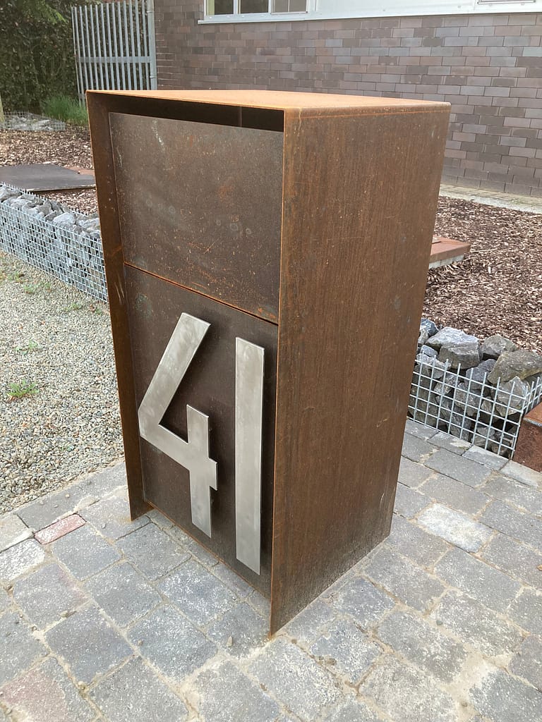 De bruine roestkleur is afkomstig van het Cortenstaal dat wordt gebruikt bij deze brievenbussen. Een typische metaallegering die tevens wordt gebruikt voor de afboording van tuin of gazon. Cortenstaal staat voor ‘corrosion resistent’ en ‘tensile strength’, wat neerkomt op een oerdegelijke, corrosiebestendige brievenbus met roestkleurig oppervlak.